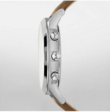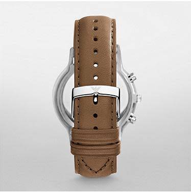 Stainless steel case with a leather strap. Fixed stainless steel bezel. Textured degrade dial with silver-tone hands and index hour markers. The Emporio Armani logo appears at the 12 o'clock position. Minute markers around the outer rim. Dial Type: Analog. Date display between 4 and 5 o'clock positions. Chronograph - three sub-dials displaying: 60 second, 60 minute and 24 hour. Quartz movement. Scratch resistant mineral crystal. Pull / push crown. Solid case back. Case diameter: 43 mm. Case thickness: 11 mm. Round case shape. Band width: 22 mm. Band length: 8 inches. Tang clasp. Water resistant at 50 meters / 165 feet. Functions: chronograph, date, hour, minute, second. Casual watch style. Armani Classic Chronograph Textured Degrade Dial Leather Mens Watch AR2471.