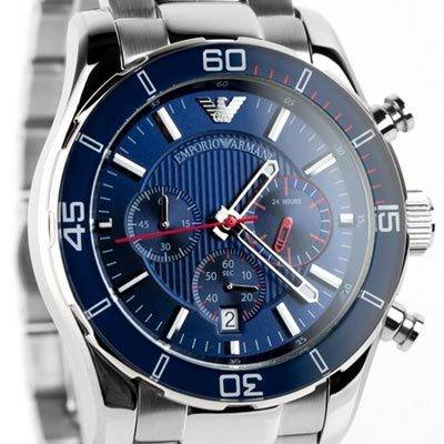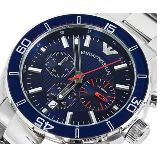 Arrive on time in Emporio Armani. This sporty style features a chronograph dial for added functionality along with subtle red accents. The stainless steel bracelet, with both polished and brushed finishes, completes the look.