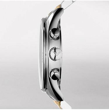 A sporty two-tone chronograph dial complements brushed and polished silver- and gold-tone stainless.