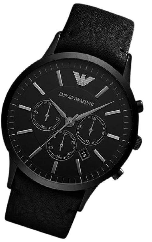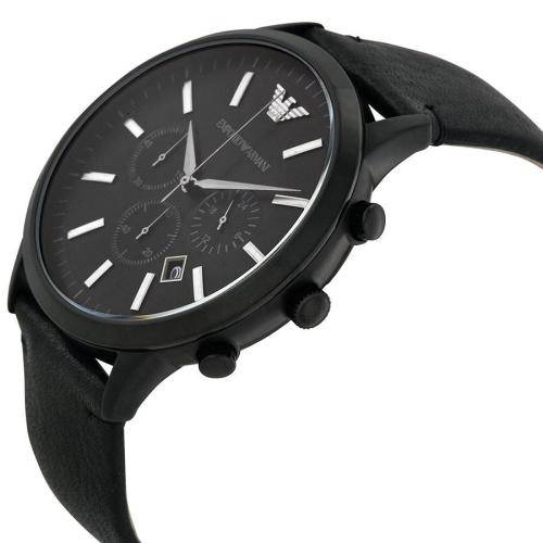 This Emporio Armani timepiece features a black dial on a plated stainless steel case. A matching leather strap completes the look.