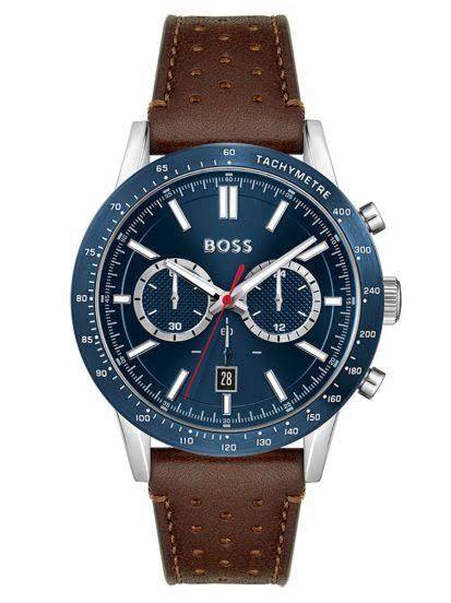 Stay stylishly punctual with this classic Hugo Boss timepiece. Crafted with sturdy stainless steel and a rich brown leather strap, this quartz chronograph is designed to stand the test of time. The 44 mm blue dial and mineral crystal lens provide resilient durability, while detailed index markings lend sophistication.