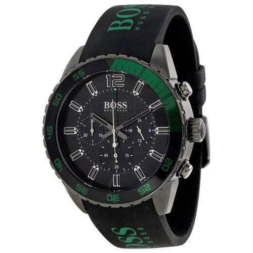 Black PVD stainless steel case with a black silicone strap. Uni-directional rotating black and green PVD bezel. Arabic numeral marks the 12 o'clock position. Minute markers. Dial Type: Analog Chronograph - three sub-dials displaying: 60 second, 30 minute and 24 hour. Quartz movement. Scratch resistant sapphire crystal. Screw down crown. Solid case back. Case diameter: 45 mm. Round case shape. Band width: 20 mm. Band length: 8 inches. Tang clasp. Water resistant at 50 meters / 165 feet. Functions: chronograph, hour, minute, second. Casual watch style. Hugo Boss Chronograph Black Dial Black Silicone Men's Watch 1512847.