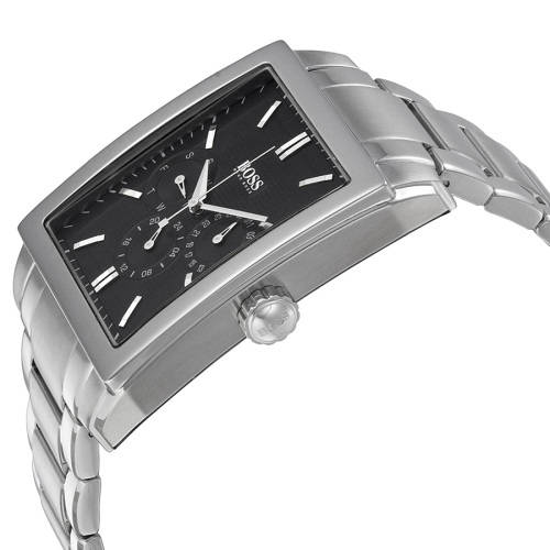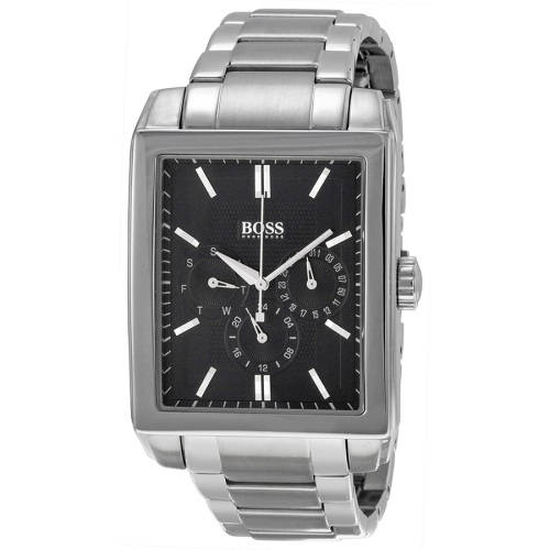 Stainless steel case with a stainless steel bracelet. Fixed stainless steel bezel. Black dial with silver-tone hands and index hour markers. Minute markers around the outer rim. Dial Type: Analog. Three multi-function sub-dials: 24 hour, date and day of the week. Quartz movement. Scratch resistant mineral crystal. Solid case back. Case diameter: 35 mm. Rectangle case shape. Band width: 22 mm. Deployment clasp. Water resistant at 30 meters / 100 feet. Functions: date, day, hour, minute, second, 24 hour. Casual watch style. Hugo Boss Multi-Function Black Stainless Steel Men's Watch 1512891.