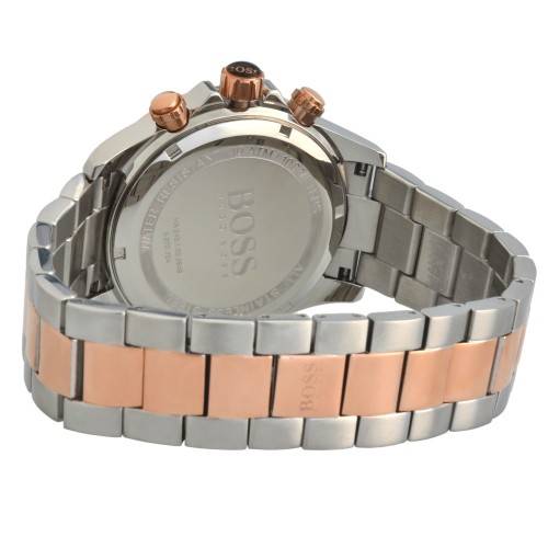 This mens Hugo Boss HB 1513339 watch is made from rose PVD stainless steel and is powered by a chronograph quartz movement. It is fastened with a silver and rose gold PVD metal bracelet and has a charcoal grey dial.