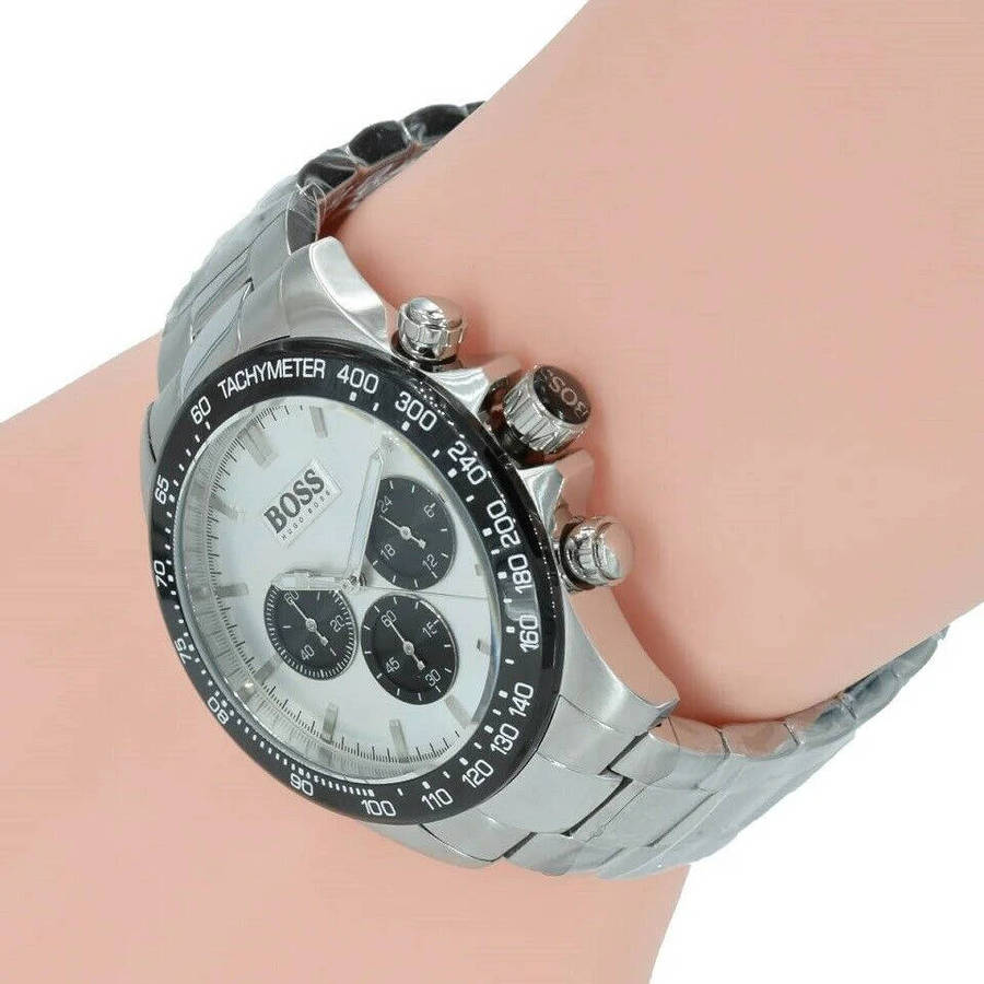 HB1512964 is a cultivated time-piece from the Hugo Boss Ikon collection. Featuring a polished & brushed stainless steel case & bracelet. A white sun-ray face with black chronograph dials and tachymetre function. This watch is a stunning piece for all types of occasions.