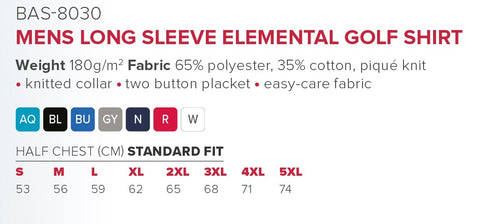 The Mens Long Sleeve Elemental Golf Shirt is a 180gsm 65% polyester and 35% cotton blended golf shirt in a pique knit design with a four-button placket. The ideal basic golf shirt to wear under a light winter jacket or to pair with your favorite jeans for a casual workplace look. Available in a range of great colors. Standard fit.