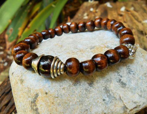 The bracelet's is made with 27 wooden beads and an garnet 'guru' bead and is approximately 20.3 cm long and is made with stretch material.