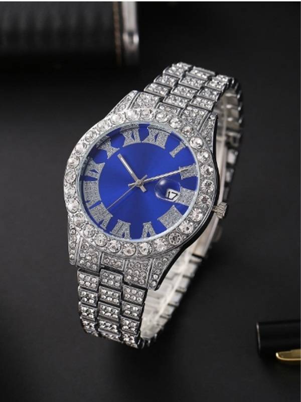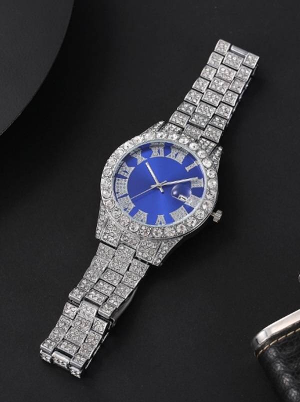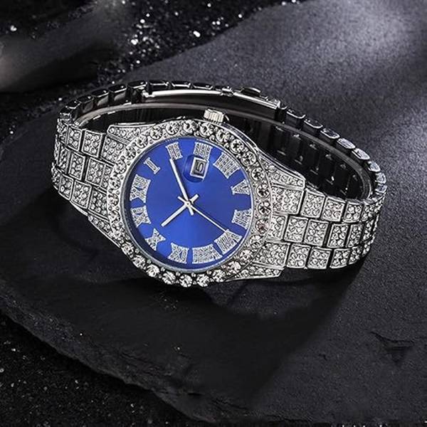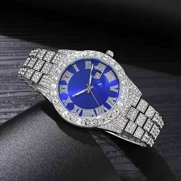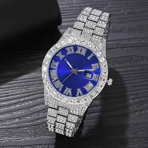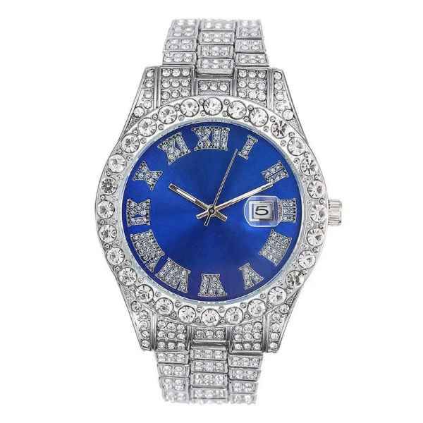 The dial features an eyecatching luxurious blue backdrop with iced out roman numerals that sparkle in any setting for an opulent appearance.