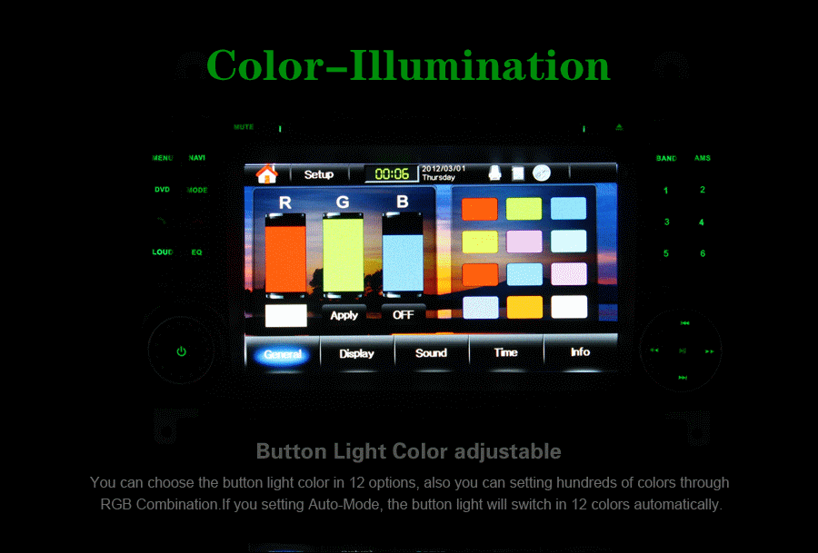 There are many kinds of button Backlight color for your choice, if you set Auto Mode, the button backlight will switch with 12 colors automatically, or that you can set fixed button backlight color manually, through the RGB collocation, there will be many Colors available.