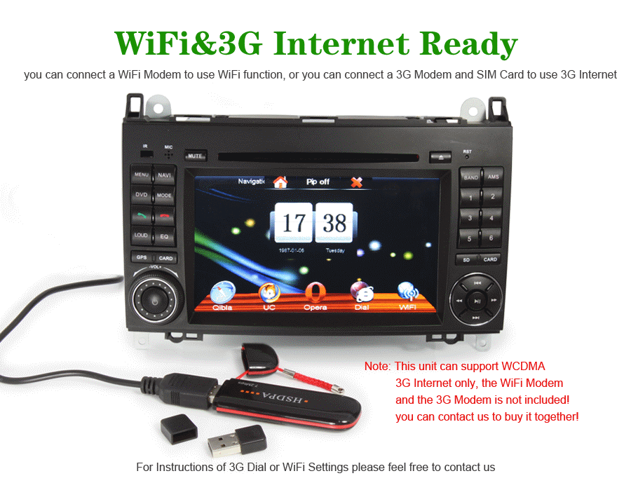 Internet function built in, with it you can use WCDMA 3G or WiFi, but please note one 3G or WiFi adapter is needed.