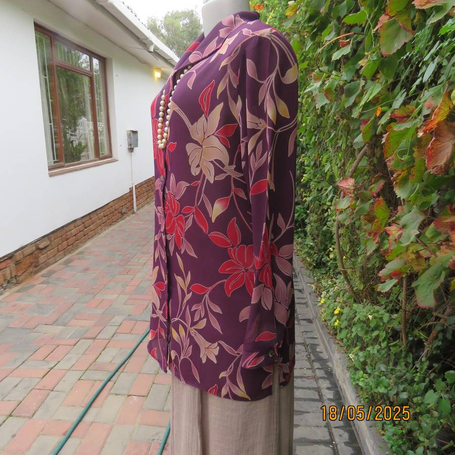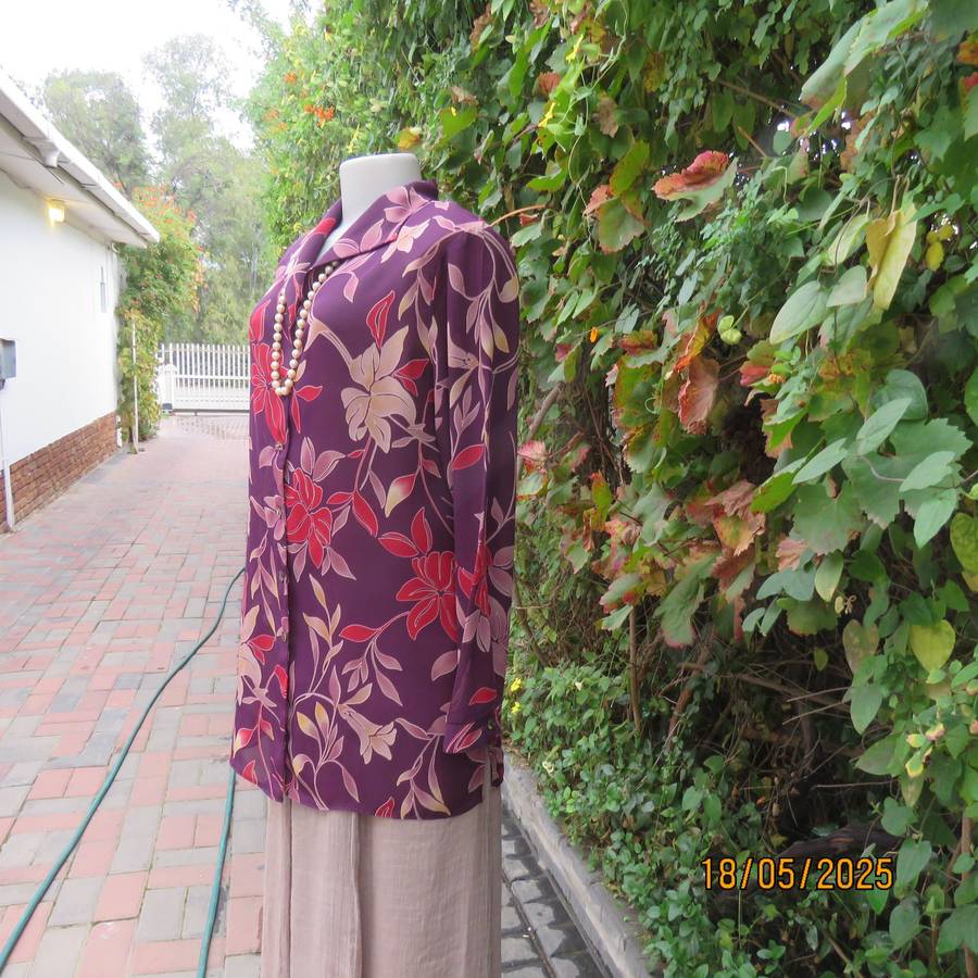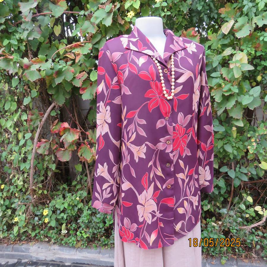 MERIEN HALL long sleeve 100% polyester button down top in red wine colour with rust and ecru bold floral pattern. Open neck with collar. With sleeve cuffs. Size 38-14. Slits at sides.
