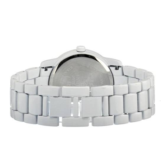 Window material type: Mineral; Case diameter : 38 mm; Case Thickness: 6 mm; Band length: Women's Standard painted white; Band width: 19 mm; Dial colour: White; Movement: Quartz; Water resistant depth: 100 Feet; Sub-dials are decorative only (Calendar, Day and date- No function).