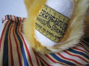 Beautiful classic Merrythought " Bear in a Bag ", fully jointed, black boot glass eyes and the classic Merrythought mouth. this baby is in perfect condition and has been kept for many a year in a display cabinet, he is a limited edition and is number 49 of 500 and is made with Schulte mohair. He has his very own bag and matching bowtie, and has all his labels and papers. Suze 27cms high by 17cms high.