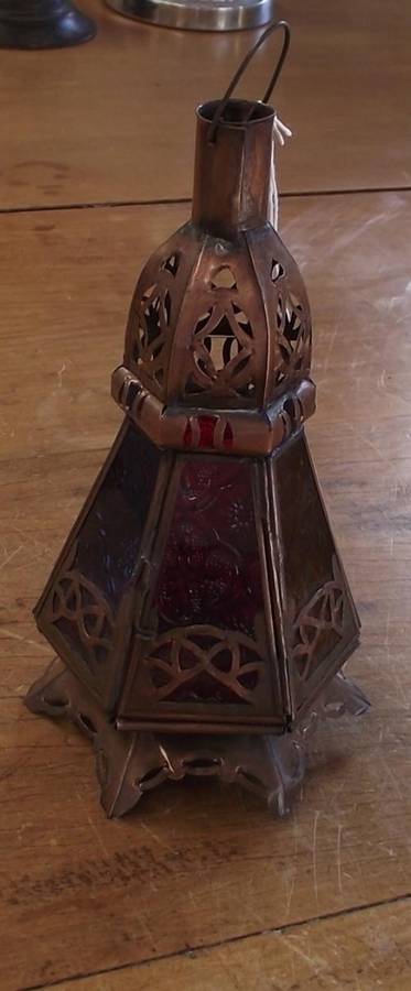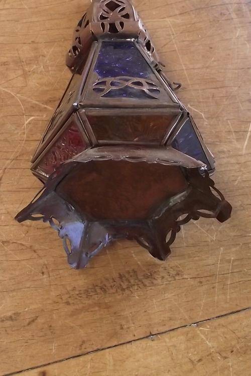 Its in good condition - copper coloured metal with differing coloured glass You open a door to insert the candle