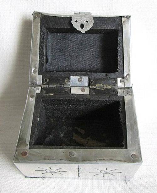 A lovely vintage metal encased wood trinket box with hinged lid and latch, Size 7.5 cm x 5.5 cm x 6 cm.