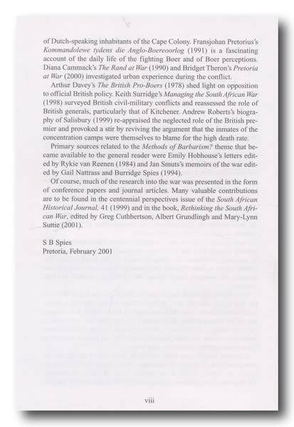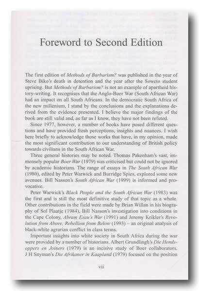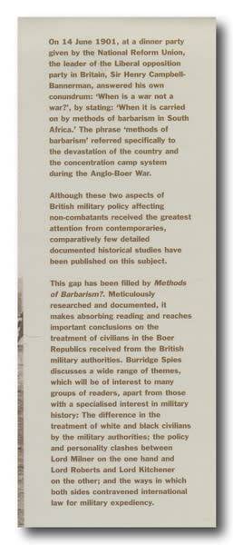Methods of Barbarism by SB Spies - Roberts, Kitchener & Civilians in the Boer Republics: Jan 1900 - May 1902. Large A5, Hard cover with dust cover, 443 pages. Dust Cover very slightly worn. Book in good overall condition.