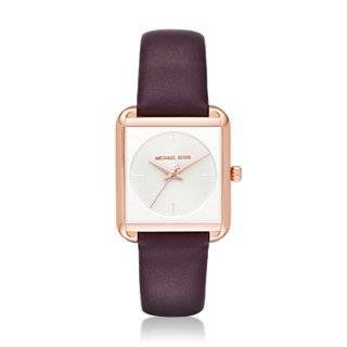 gets squared in the Michael Kors Lake watch; featuring a polished rose gold-tone case and minimalist white dial; paired with a plum leather strap.