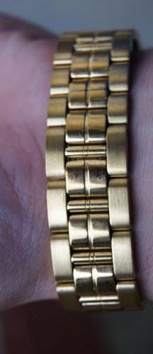 Gold plated, quartz movement, 37mm case, gold dial, will fit upto a19cm circumference wrist, sapphire glass