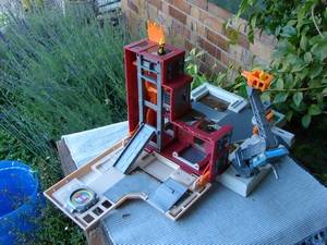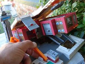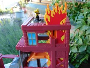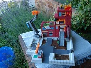Closed Fire Station measures 22cm x 23cm x 10cm high. Open Fire Station with Burning Building and 2 Fire Fighters, chopper pad, water canon, ladder and more measures 42cm 23cm 22cm high