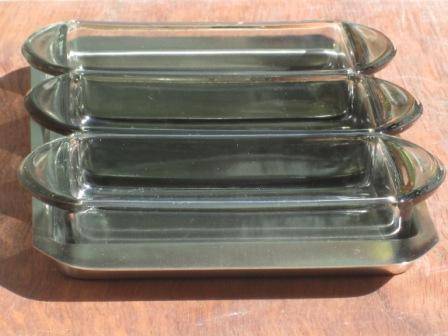 A gorgeous mid century Danish Modern serving set consisting of four Holmegaard grey glass rectangular bowls and a large rectangular stainless steel tray