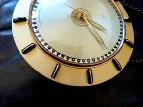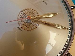 ORNATE CENTRE DESIGN AND THE SOFT GOLDEN-METAL FINISH OF THE FRAME AND UNIQUE IS THAT THE NUMBERS ARE ON THE OUTER FRAME,NOT IN THE GLASS AREA ITSELF.