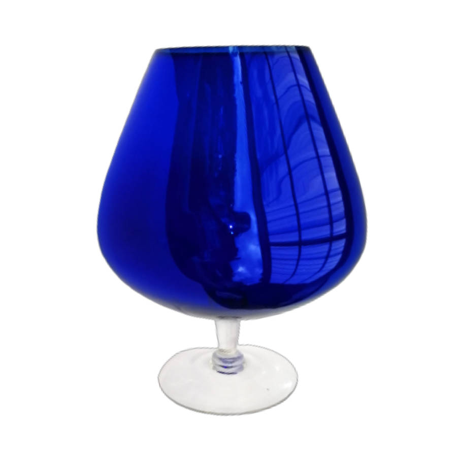Mid Century Large Deep Blue Venetian Goblet Vase with Clear Stem, The vase measures 30 x 22 x 22 cm and is in excellent condition, making it a captivating decorative piece.