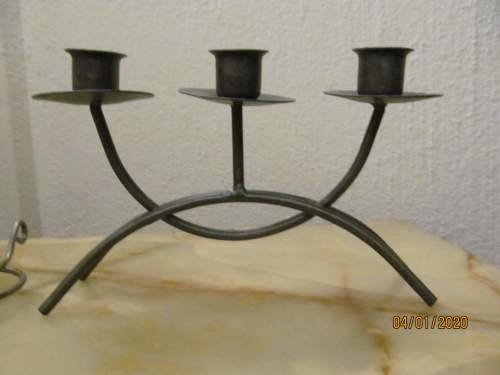 1)- A BLACK PAINTED WROUGHT IRON THREE-SOCKET CANDELABRA MNUFACTURED IN AN ART DECO DESIGN. EACH CANDLE SOCKET HAS A DRIP TRAY ATTACHED. THE ITEM IS NOT MARKED OR STAMPED. IT IS IN PERFECT CONDITION WITH NO DAMAGES, RUST ETC. 13.4cm HEIGHT.....20.5cm LENGTH.....6cm WIDTH. THE ITEM TAKES STANDARD SIZE CANDLES