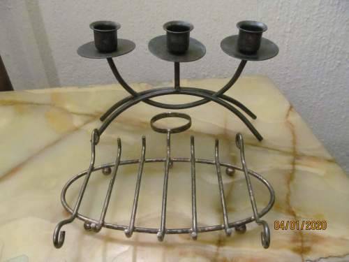 VINTAGE LOT OF BLACK WROUGHT IRON THREE-SOCKET CANDELABRA AND SILVER PLATED CASSEROLE DISH STAND/TRIVET