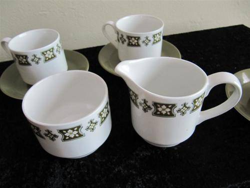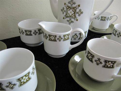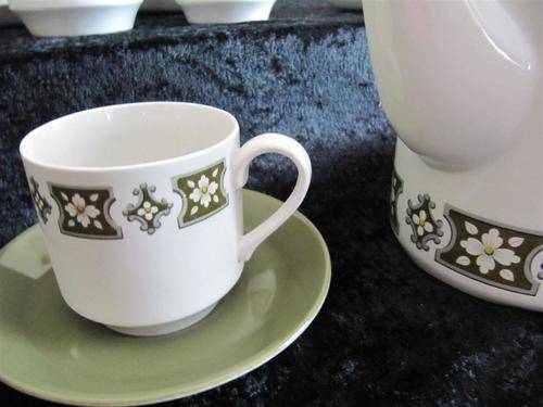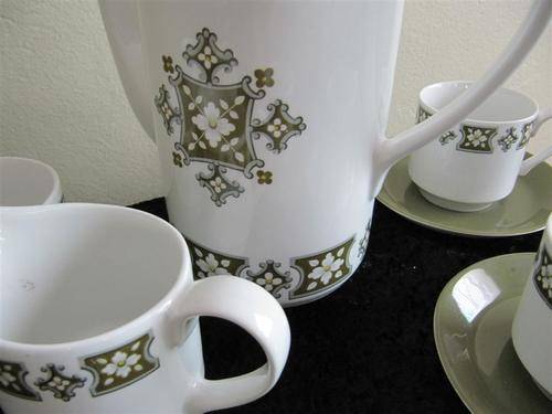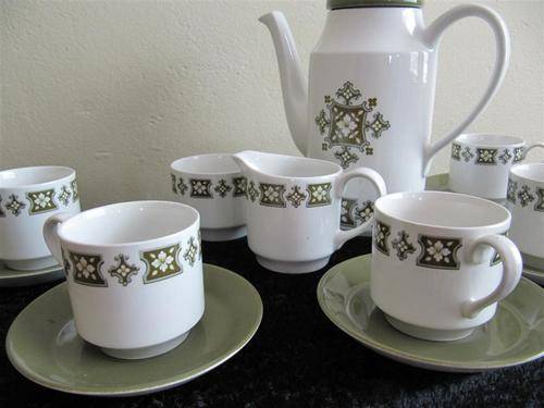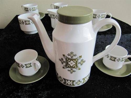 Research shows this pattern was produced between 1962 - 1973. Called the Lynton pattern designed by John Russell, it features dark green tones on a white base. In mint condition with no chips nor cracks. Includes five cups and saucers, the coffee pot with lid, and the sugar bowl and creamer. See photos for all details!