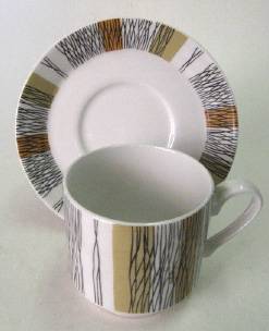 A Midwinter coffee cup and saucer, decorated with the Sienna pattern -- designed by Jessie Tait and produced from 1962 to 1978 -- on Fine shape tableware designed by the Marquis of Queensberry and Roy Midwinter. Condition good. SIZE: cup rim diameter 65 mm; cup height 65 mm; saucer diameter 125 mm. Three other identical items are listed separately.