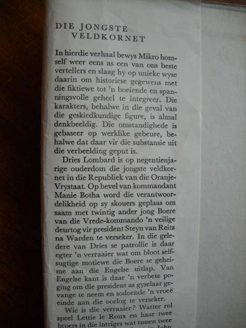Hardeband met stofomslag. Boek in mooi toestand, behalwe vir voorste skutbladsy wat verwyder is (sien foto). Binding is stewig en boek is skoon binne. Verbruining van blaaie sigbaar. 1964 - uitgawe met 124 bladsye. Die stofomslag toon geringe rakskaafmerke. Die skrywer openbaar menslike konflikte van liefde en nasieskap. Posgeld in RSA = R43.00