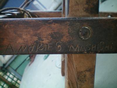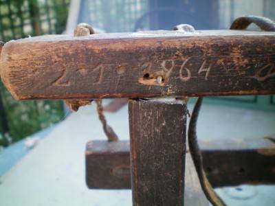 This little milking stool has seen some heavy wear. Many cows!!!! The milk man"s name, Andries Mashishi, has been carved into the wood and also the date 2.1.1964. This has undergone some restoration with glue. Stands 23cm high and is about 38cm long.