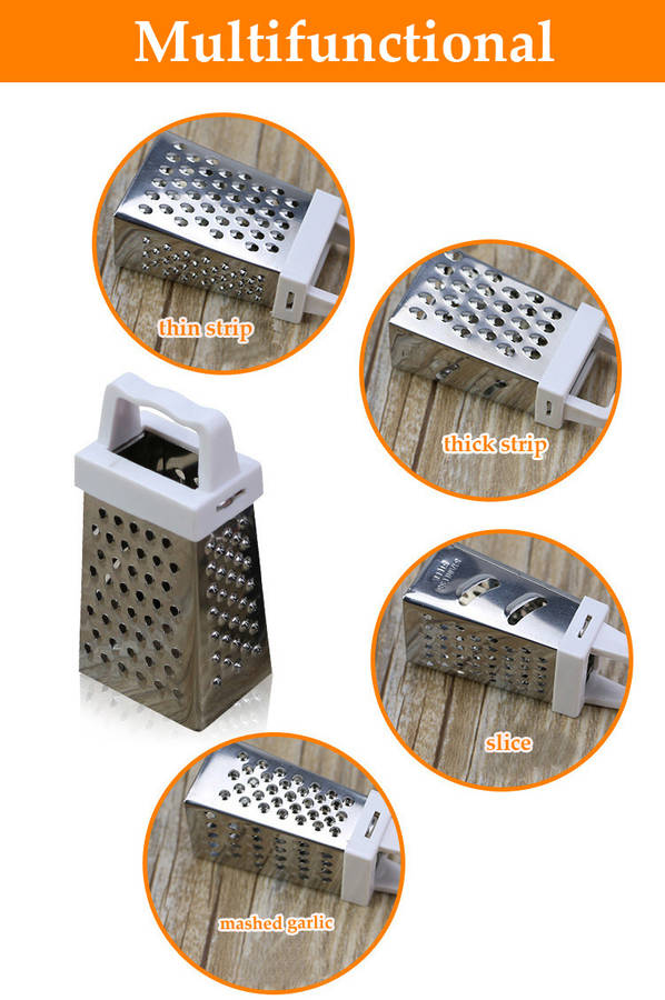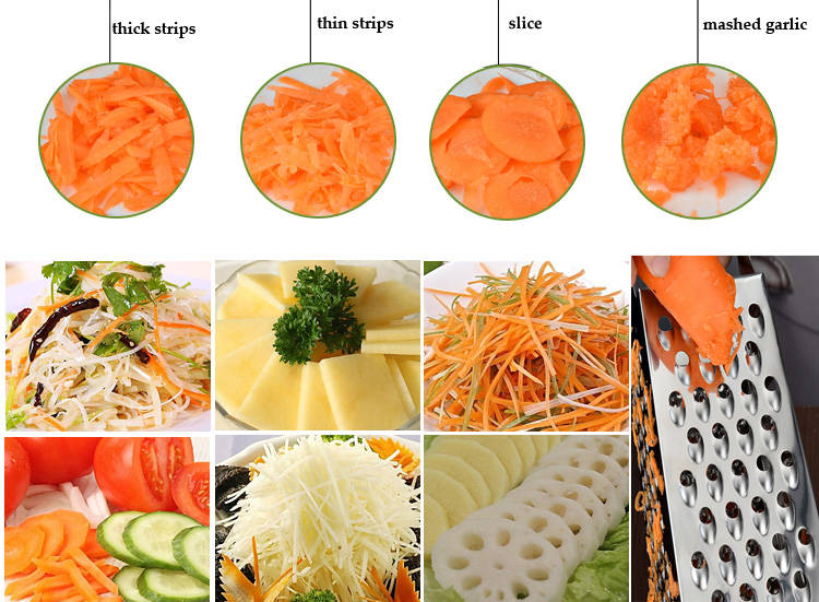 Description: Multifunctional, 4 sides are available, you can make thick/thin spiral, slicer, and mashed garlic High quality stainless steel, rustless, and has pass food test Can be use to cut carrot, potato, cheese, garlic and so on Specification: Material: Stainless Steel+ABS SIZE: H:6.5cm/2.6Inch Color: Randomly Shipping Package Includes: 1 x 4 Sides Vegetalbe Slicer