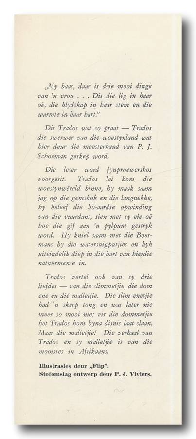 TRADOS - die swerwer-Boesman deur PJ Schoeman (4e druk Jan 1967). A5, hardeband met stofomslag, 220 bls. Stofomslag redelik verweer. Boek binne in baie goeie toestand.