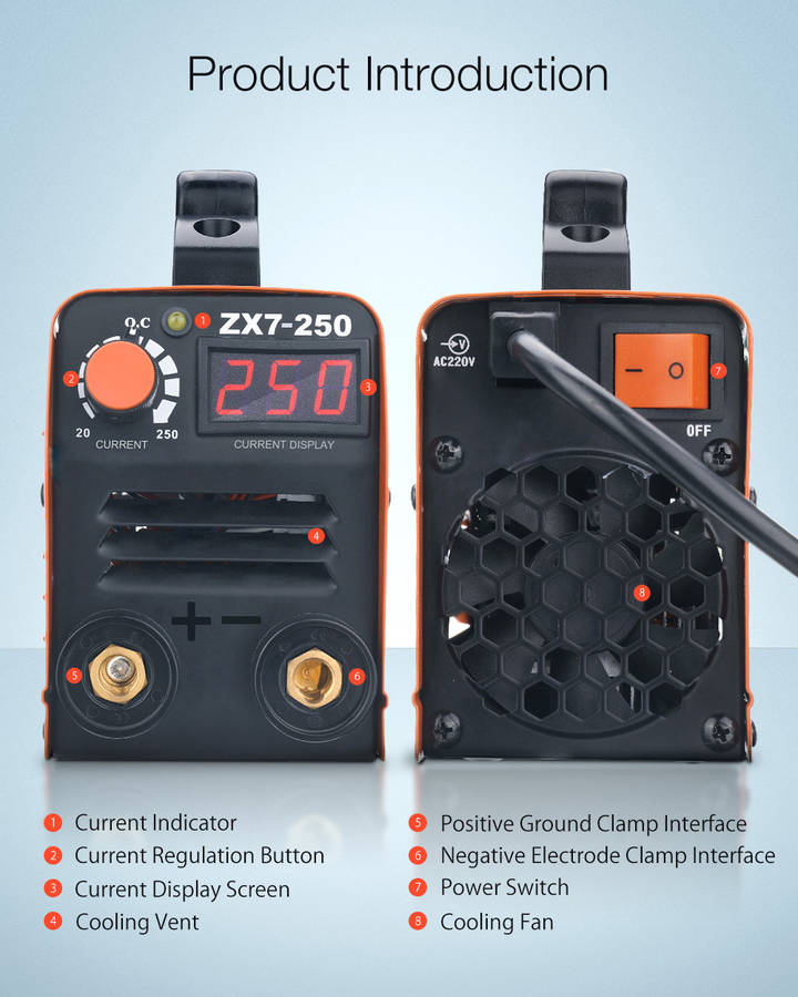 | Package | 1 x ZX7-250 Welding Machine 2 x Quick plug 2 x Insulated electrode 1 x T-wrench 1 x Power Cord 1 x English Manual 1 x Warranty Card |