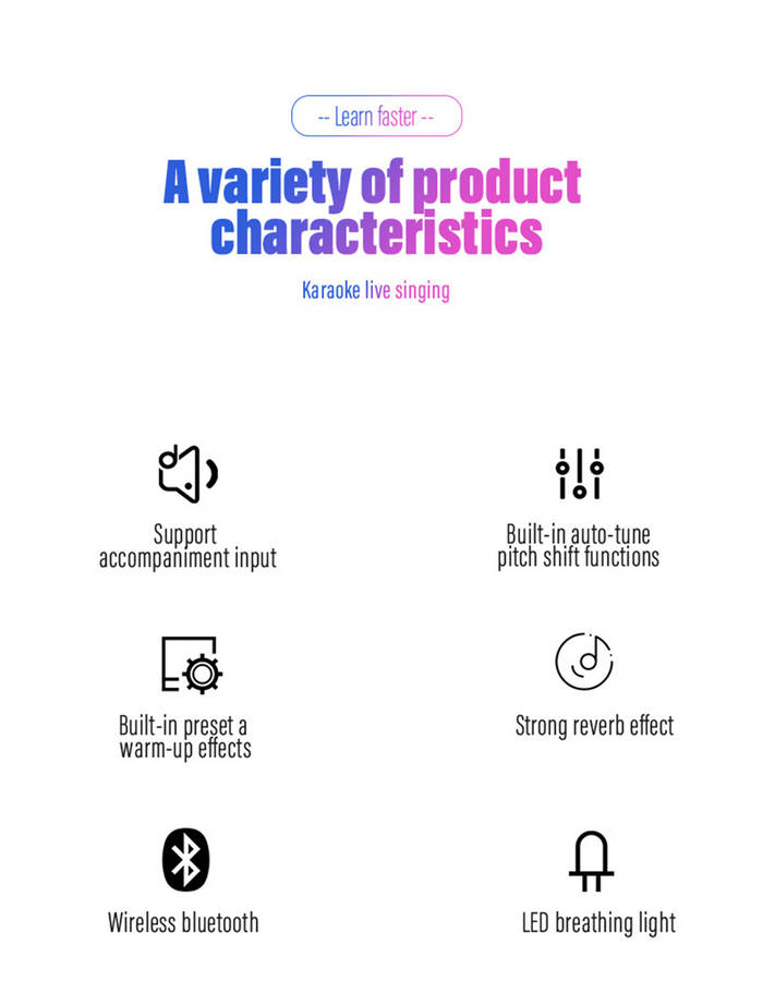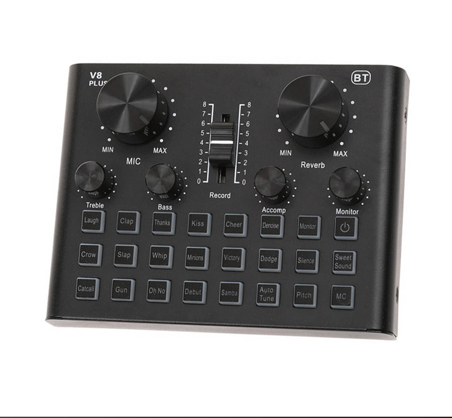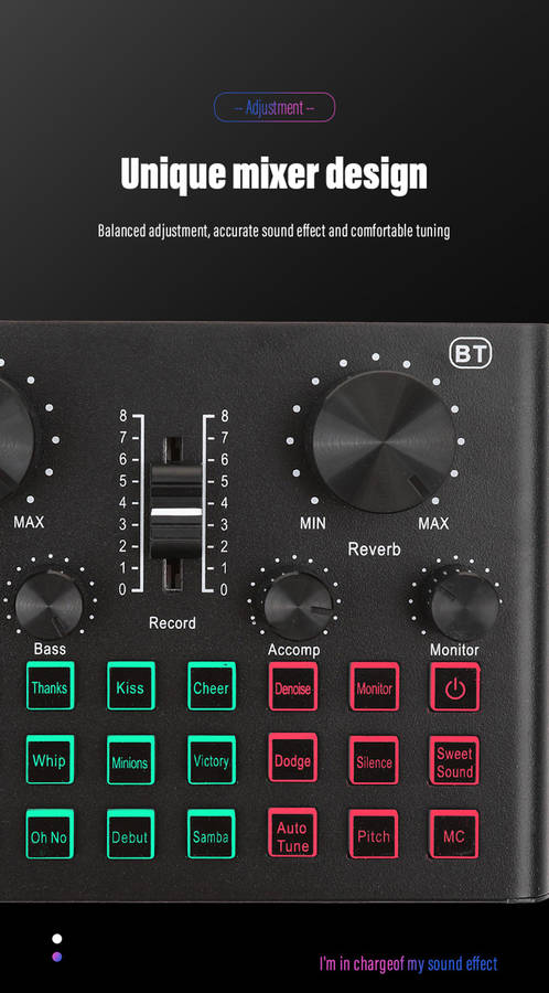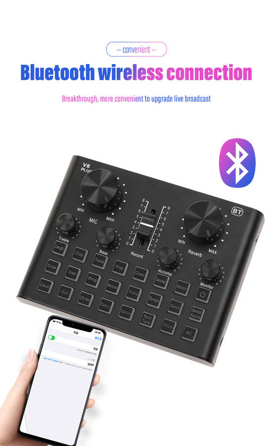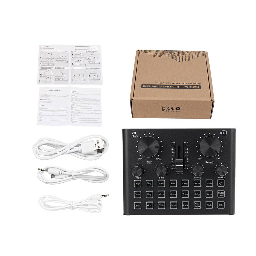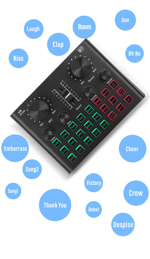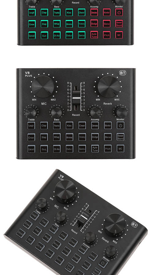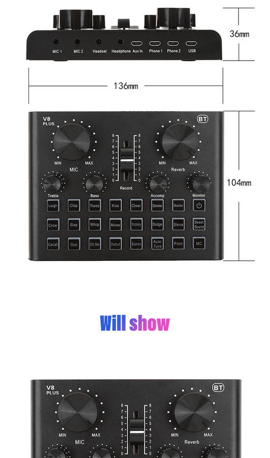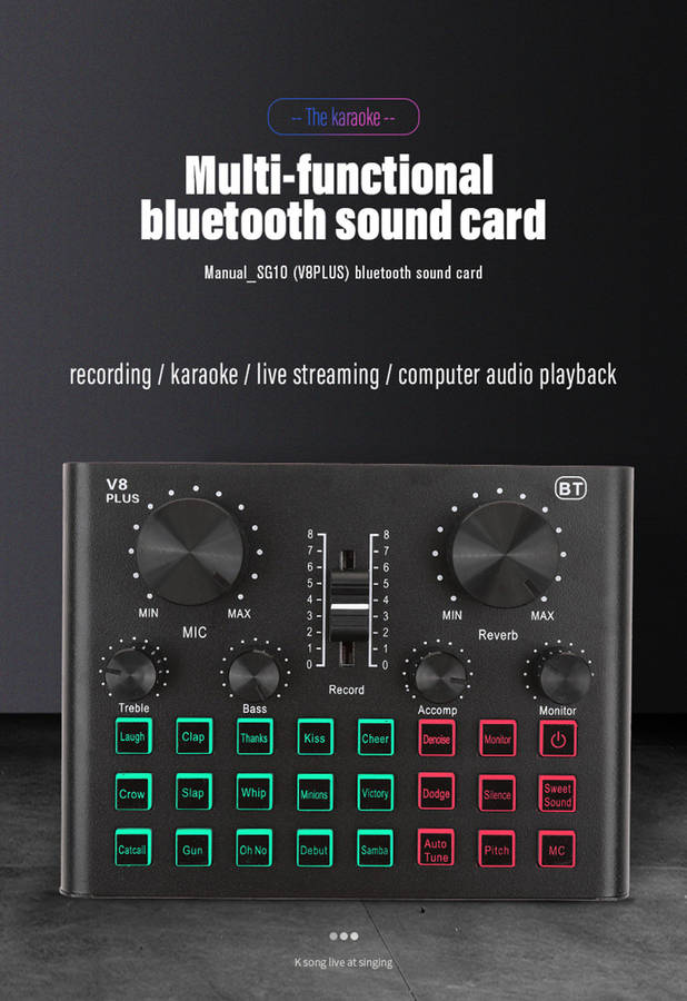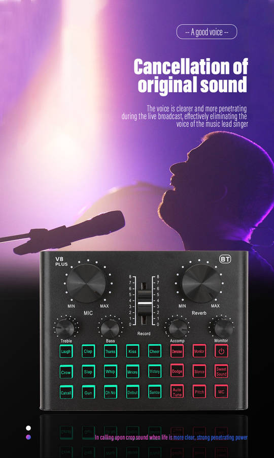 Features: Built-in 15 independent live sound effects and 8 voice effects, all kinds of interesting sound effects, with one-button switch, it`s easy to ignite the atmosphere while live. Dual DSP sound beautification provides more silent environment with professional sound pick up and intelligent noise reduction and more effectively filter environmental noise. Provides multiple functions: volume control, reverb control, accompaniment, treble control, bass control, as well as recording and plug and play, easy to operate. Including many input ports, can connect with two microphones, two mobile phones, headset, headphone, accompaniment and PC, and supports BT connection. With compact size, exquisite appearance and dazzling colorful Silicone button, a perfect choice for live streaming, broadcast, gaming, karaoke and so on.