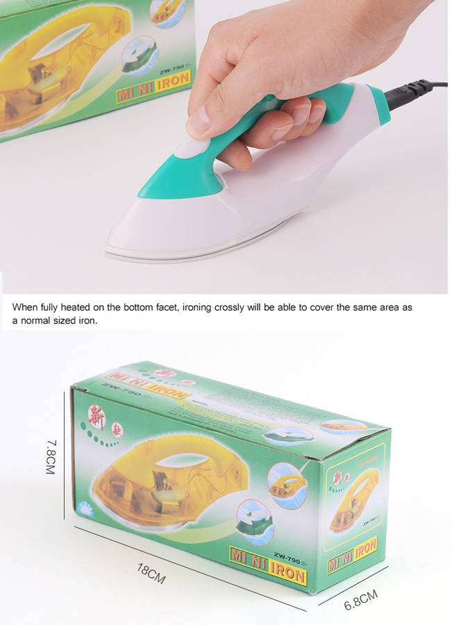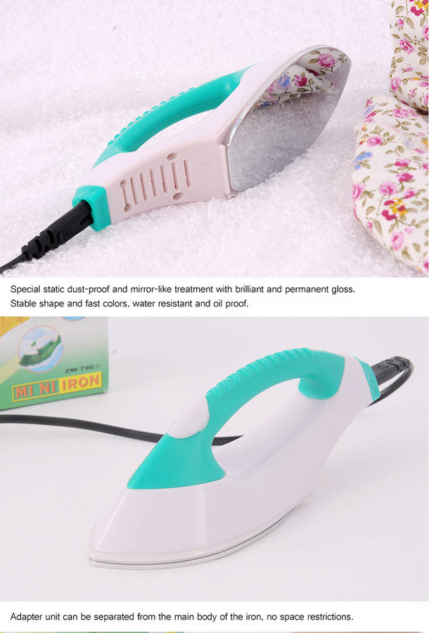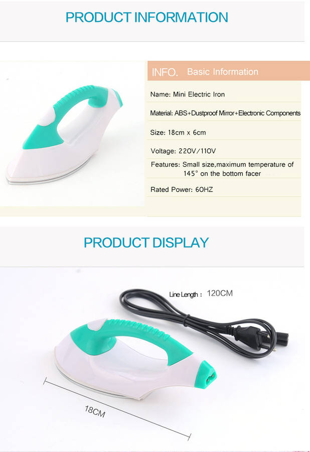 The mini portable iron is great for home and travelling, convenient and practical, to solve the creases problem of your clothes whenever and wherever. Special static dust-proof and mirror-like treatment with brilliant and permanent gloss. Stable shape and fast colors, water resistant and oil proof. Small and exquisite design.No dead corners even with the sleeve or the collar, perfect to play the role of ironing clothes. Maximum temperature of 145° on the bottom facer. Low energy consumption, power consumption while on standby is 35Watts. While ironing, power consumptionis 100Watts. After the power test, to ensure your Electrical Safety.