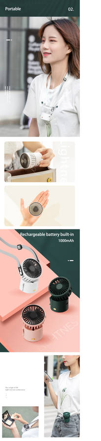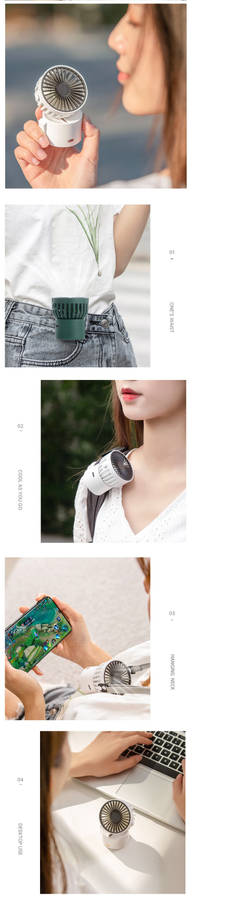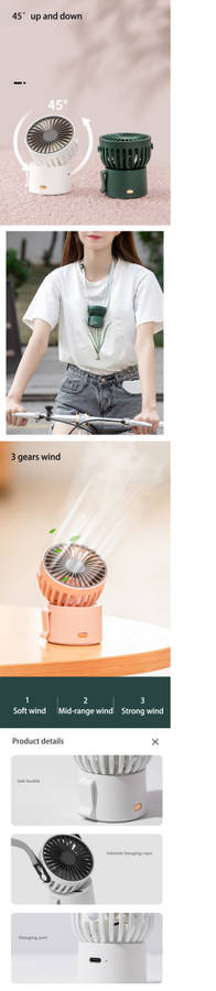 | Specification | Color: White/Black/Green/Pink Material: ABS/PP Voltage: DC5V /1A Power: 3.5W Wind Speed: 3gear Working Time: about 5.5/2.5/1.5h Charging Time: 1.5h |