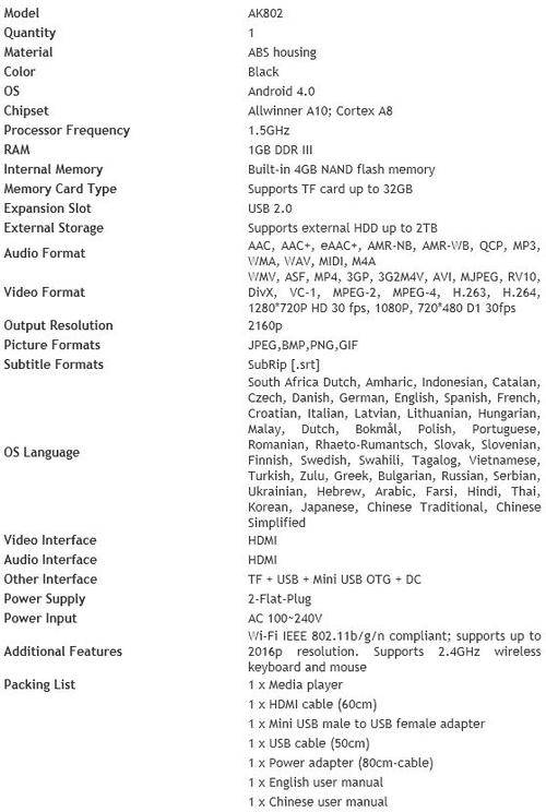 The latest product MK802+ is the world's smallest Google TV Player, it uses the most advanced mobile Internet devices ARM Cortex-A8 1GHz core processor. Built-in 3D graphics processor with 1G DDR3 large-capacity memory, performance is extremely powerful and can rival desktop machine high-speed computing power and will give you smooth high-definition video and gaming experience! At the same time, it uses the latest Google Android 4.0 operating system, not only has stable system but also can be mounted and use millions of applications and games of the Google Market. Of course, if equipped with a highly efficient 2.4G ultra-thin wireless mouse or keyboard, you can surf the Internet, browse gossip, office, chat, micro blogging, letter ...... instantly upgrade your living room to the digital frontier. You just need to sit on your sofa; everything is in front of you.