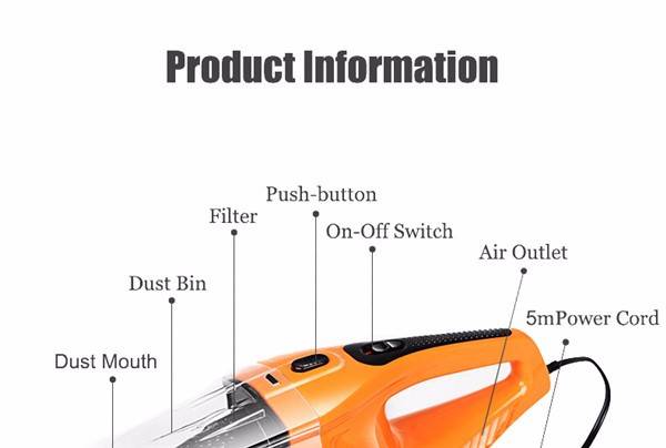 Material:Plastic & Metal Color:Orange Size:35cm x 10cm x 12cm (Approx.) Rated Voltage: DC12V Power:100W Vacuum Degree:4000Pa Cigarette Lighter Connector Cable Length:5m( It Can be used in the trunk.)