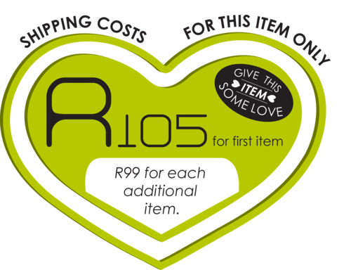 R65.00 Standard shipping applies to orders under R100.00, in most areas in South Africa. R35.00 Standard shipping applies to orders over R100.00. Some areas may attract a surcharge surcharge. This will be calculated at checkout if applicable. Check my rate