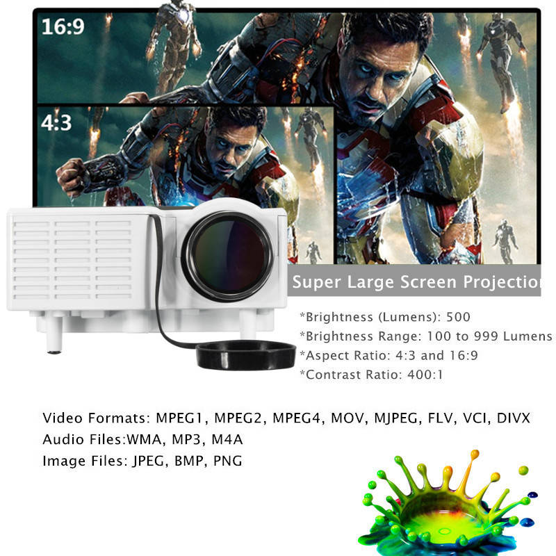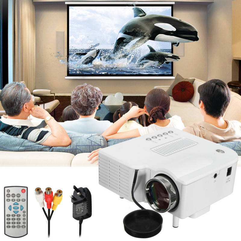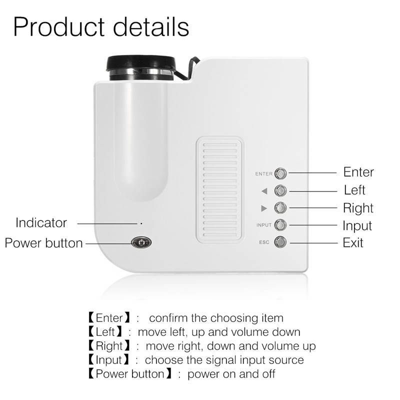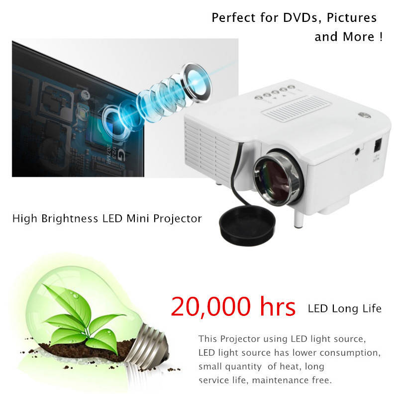 Mini Portable Resolution Home Cinema Theater Projector 48LUX Support 1080P White US UK AU EU Plug Description: This Device is perfect for Videos/Pictures, gives out a high brightness LED mini projection, and it has a 20000 hrs service life of displaying.