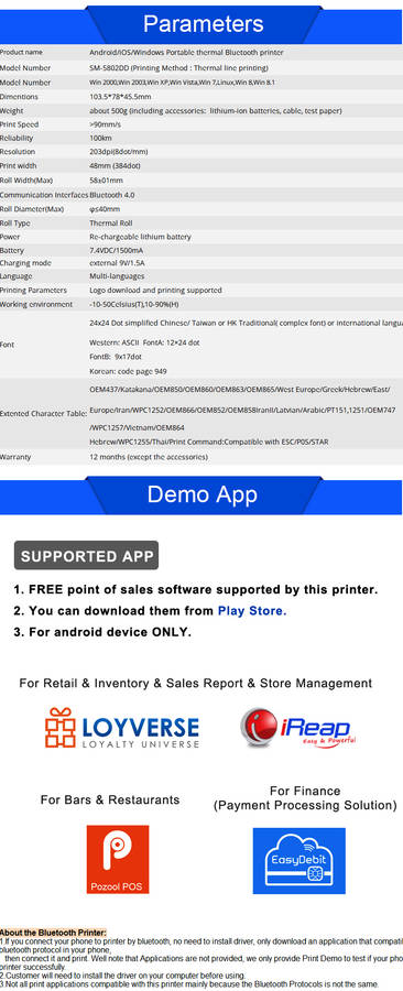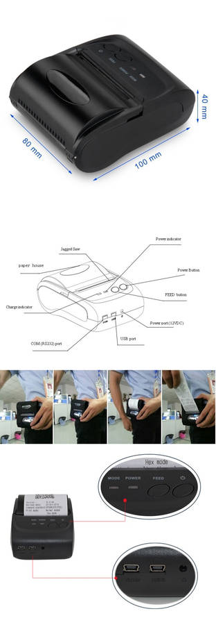 POS-5802DD portable thermal printer is widely used in fields like office, logistic system, taxi, restaurant, online payment information printing. It supports 58mm width thermal paper printing, with high printing speed, clear printing & low noise. Power saving for long time use. You can connect your devices with the printer via BT 4.0 & 3.0, USB cable or serial port line.