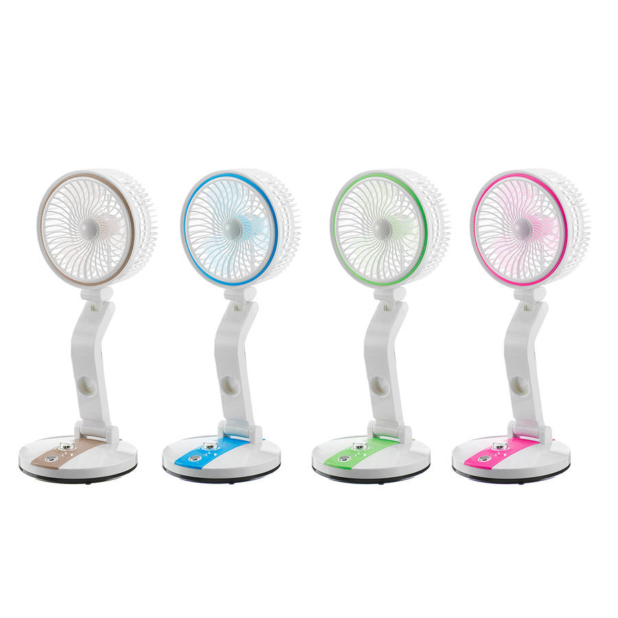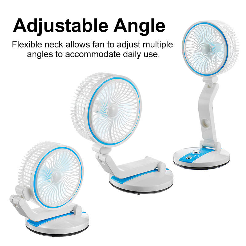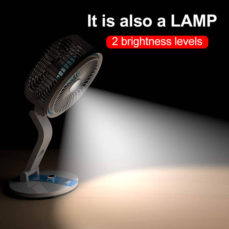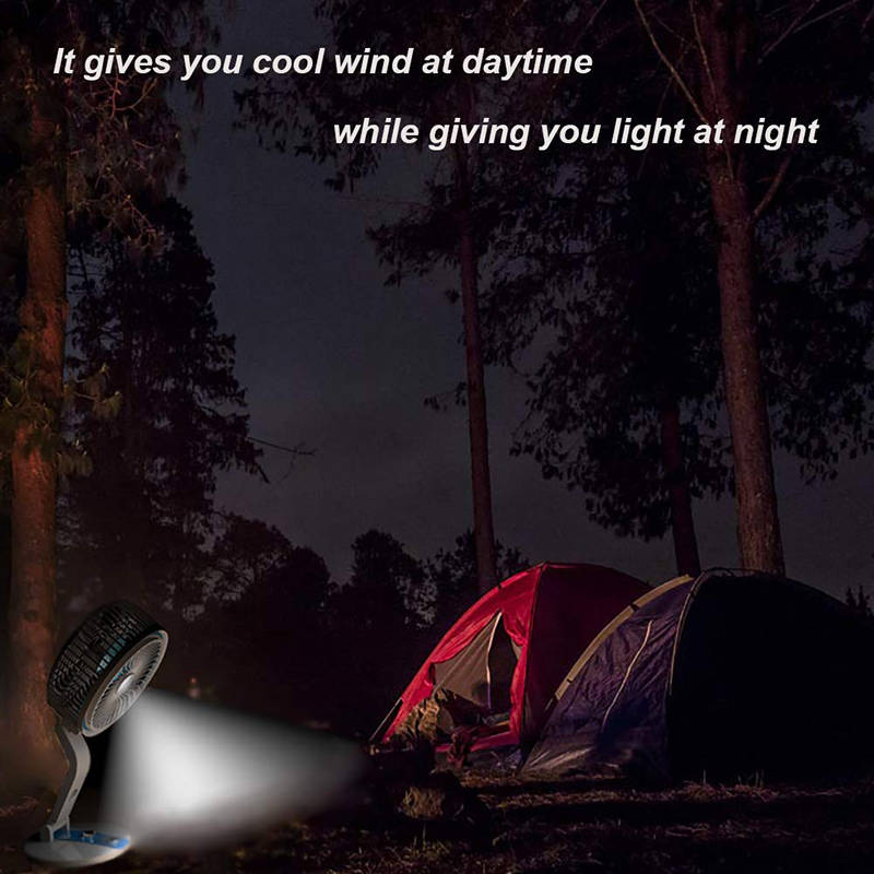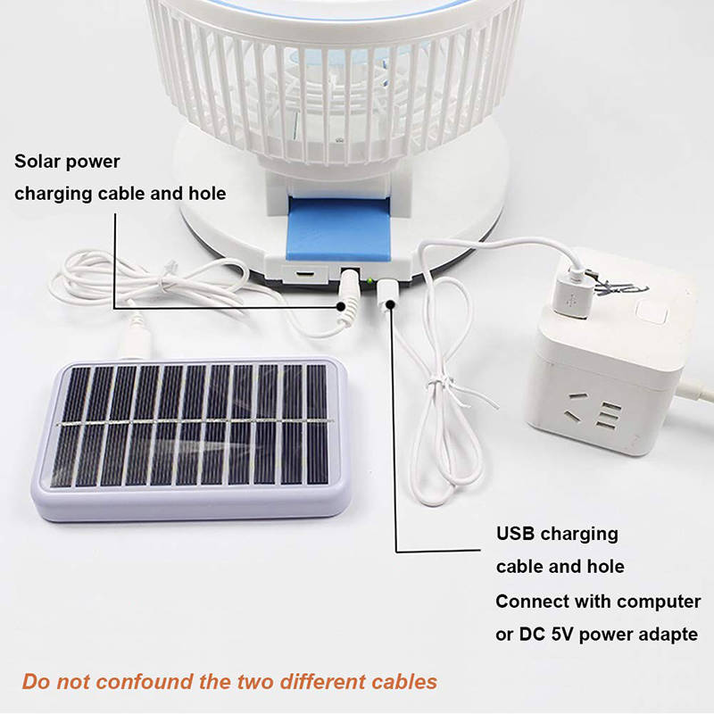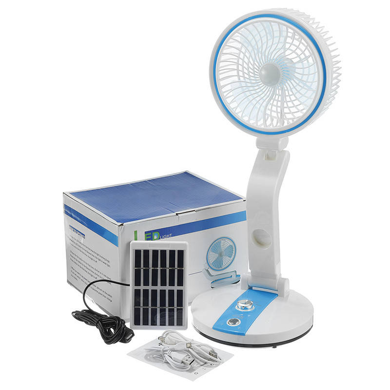Features: -Use as a desk fan or LED night light lamp - Unlimited speeds and 2 brightness can be adjusted. - Come with solar panel - Built-in 1800mAh battery, can also be charged with computer, power bank, car charger, AC adapter or other USB ports. - 180ᆪ Adjustable Angle -Quiet Fan - Safe and durable ABS Cover - Ways of Charging -USB charge - Powered by USB cable to connect with your computer or DC 5V -Power adapter. Cable is included. - Charging time: 3-4 hrs -Solar power charge -Solar charging panel and the matching cable are included. - Charging time: 10-12 hrs Tech data: -Folded height: 6 inch -Unfolded height: 18 inch -Fan diameter: 7 inch -Type of battery: 1800mAh rechargeable battery -Power consumption: 4W -Duration: 3-10 hrs depending on the speed -Material: ABS plastic Package include: -1 x Desk Fan -1 x Solar panel