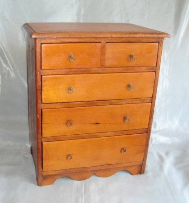 A VERY OLD (+/- 90yrs) MINI WOODEN CHEST, CONSISTING OF FIVE DRAWS WITH ORIGINAL RING HANDLES.CONSTRUCTED BY TONGUE AND GROOVE METHOD, length 33cm, width 21cm, height 40cm.