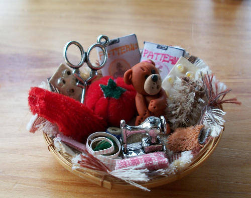 A 5x5cm basket filled with tiny sewing goodies and a tiny polymer clay bear.
