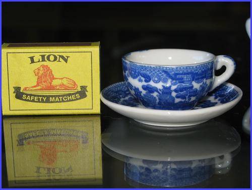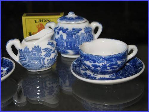A vintage miniature porcelain tea set, in the classic willow pattern, perhaps intended for a child or purely ornamental.
