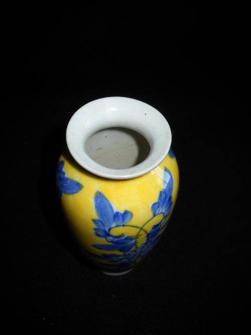 Miniature Yellow and Blue Vase. Size: 12.5cm high, 6.5cm widest width. Exquisite item - don't delay to bid on it NOW !! Notice the water marks on the inside.