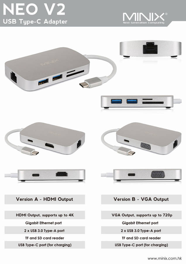 Features: MINIX new USB Type-C adapter is the world’s most comprehensive USB Type-C adapter (total of 7 ports) and the world’s first to include Gigabit Ethernet connectivity along with HDMI output, USB ports and SD card slots.
