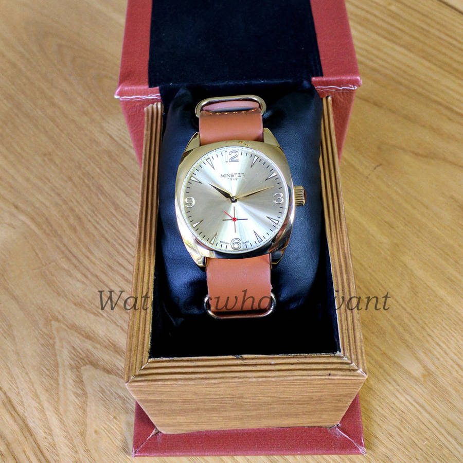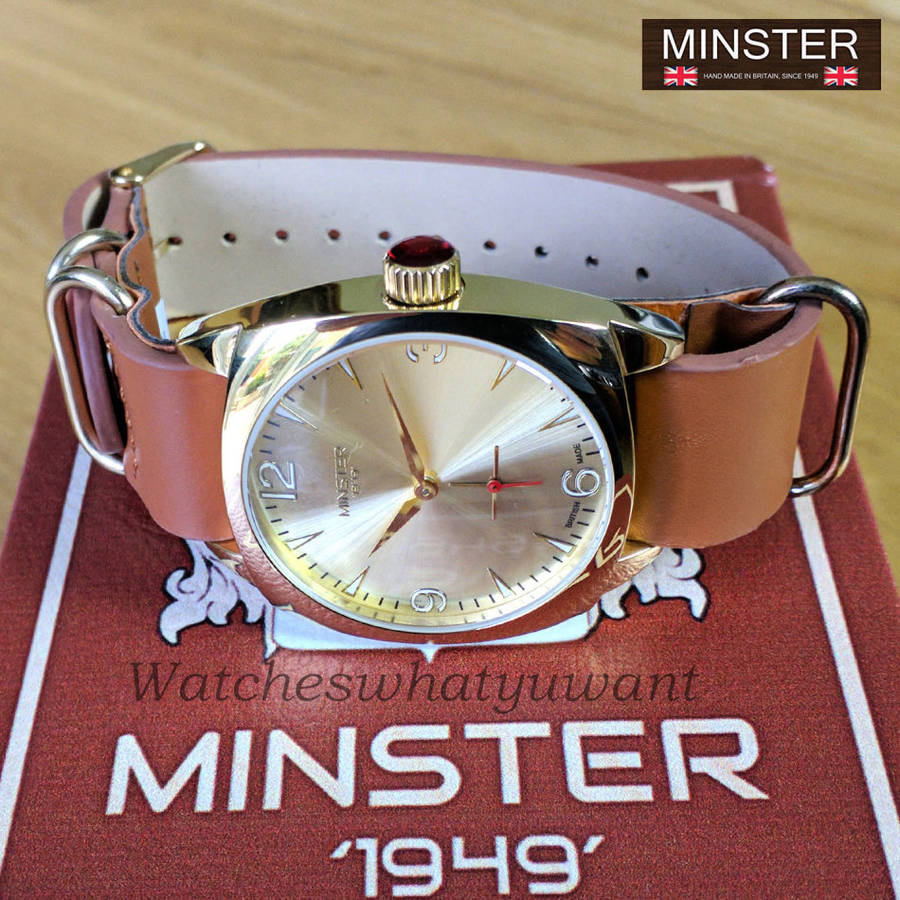 introducing this awesome analogue mens timepiece that has been manufactured by Minster 1949. It sports a brown leather strap and a stainless steel case and also a rose gold face. This Minster 1949 mens wristwatch comes with a 3 years manufacturer warranty booklet.